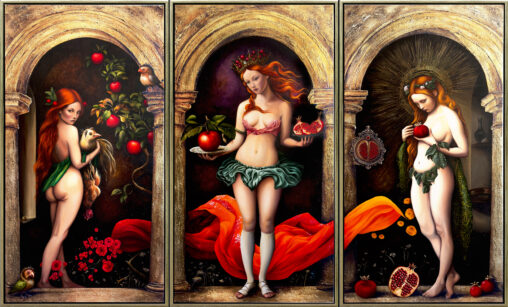Olej, technika własna na płótnie, 160×255 cm Oprawa drewniana, blade stare złoto. Ten tryptyk to odpowiedź na temat XV Biennale Sztuki we Florencji „Światło i mrok”. Wenus/Bogini…